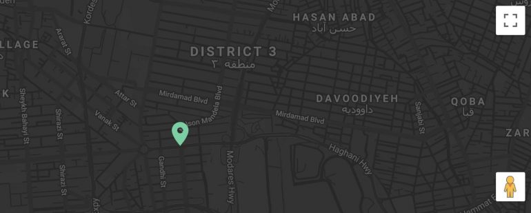 تهران، فلکه دوم صادقیه، بلوار آیت الله کاشانی، نرسیده به پمپ بنزین، جنب داروخانهی دکتر اصفهانی پلاک ۱۵ (شنبه تا جمعه ۱۰ الی ۲۱ به جز ایام تعطیل رسمی)